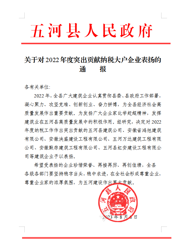 近日,五河县人民政府通报表彰了县多家纳税企业,古天乐太阳集团城虹安建设公司获“2022年度突出贡献纳税大户”称号。这既是对虹安建设公司诚信经营良好风气的表彰,也是对其为五河经济建设发展作出贡献的肯定,更是展现了虹安建设公司对外的良好形象。