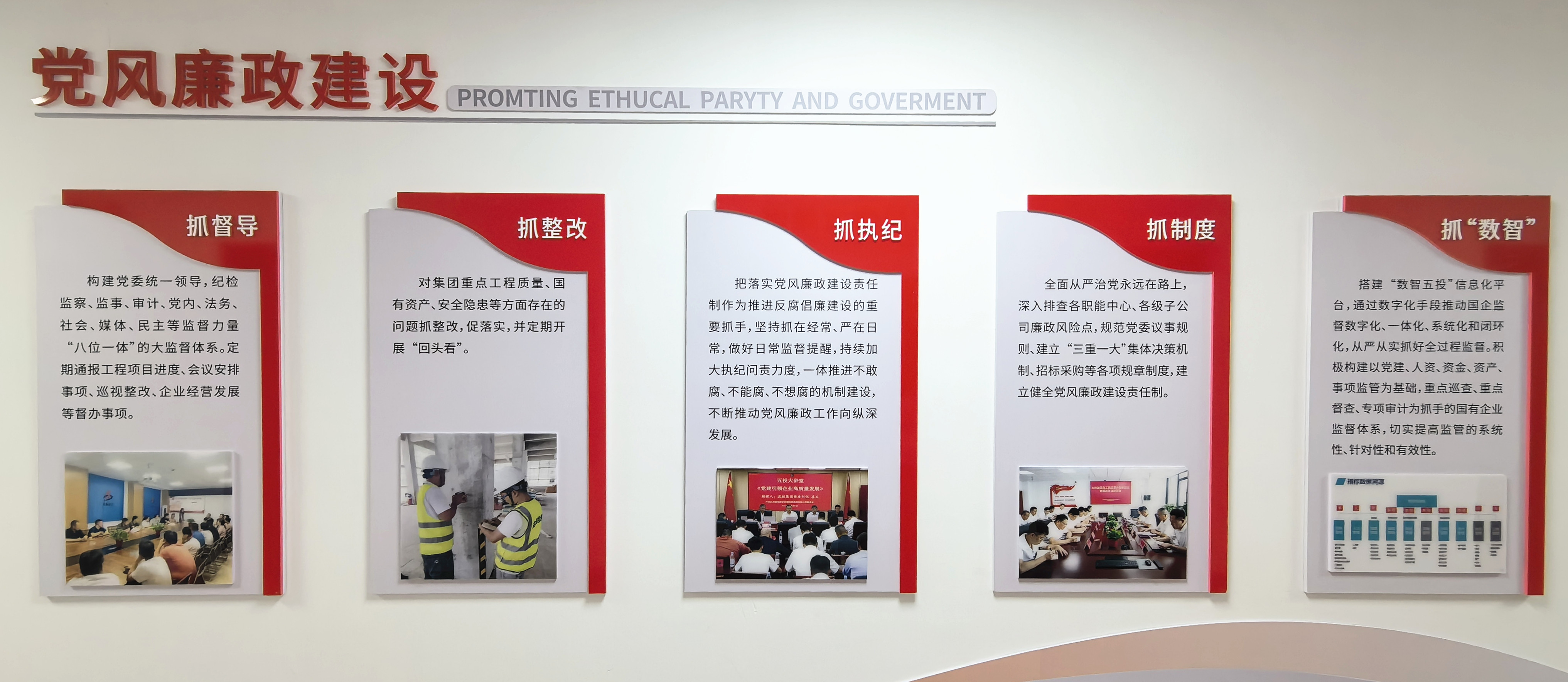紧扣自身建设,激发看齐效应。党建文化长廊充分展现集团党风廉政方面工作机制,通过法院旁听、参观警示教育基地等形式启迪和警示群体党员干部,在集团上下形成了强烈的职业认同感和归属感,引导广大党员干部坚定理想信念,推动集团党建与发展同频共振、协调共进。