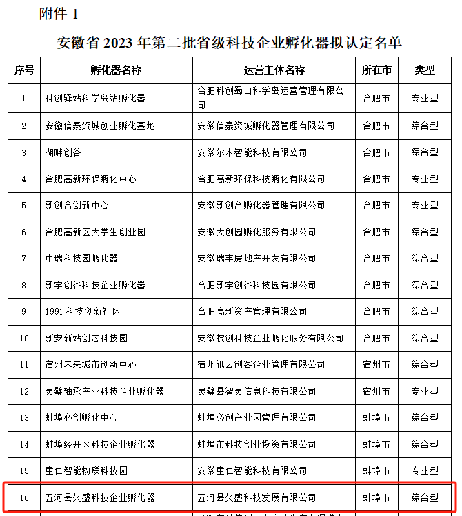 喜报丨五河县久盛科技企业孵化器获安徽省科技企业孵化器认定