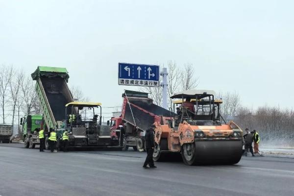 施工现场,一片热火朝天的建设场面。一辆沥青路面摊铺机配合着供料车缓缓移动,紧跟摊铺机的双钢轮和胶轮压路机来回碾压,工人们熟练地操作着机器,一条崭新的道路呈现在眼前。