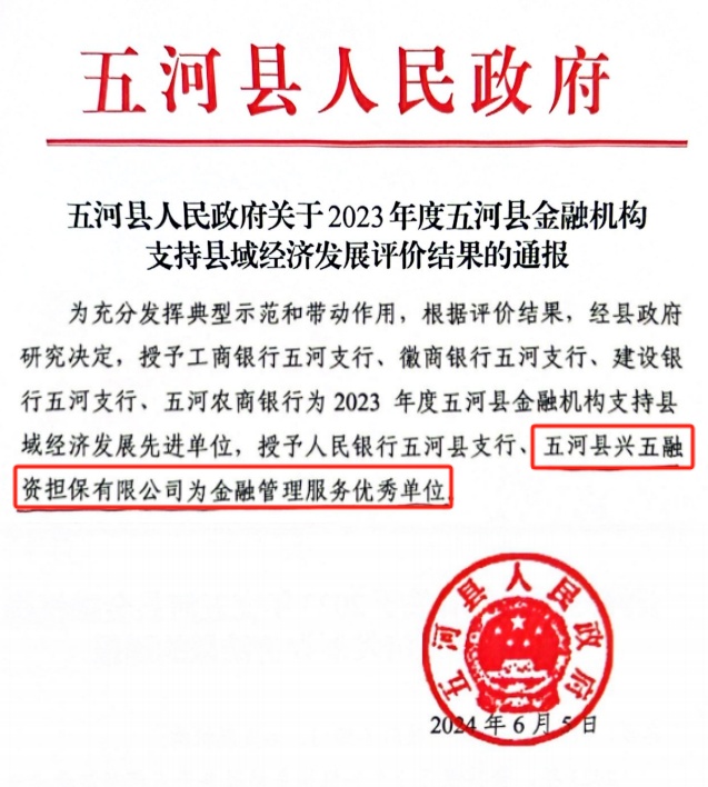 近期,五河县人民政府通报2023年度金融机构支持县域经济发展考核结果,古天乐太阳集团城兴五担保公司获“2023年度支持县域经济发展优秀单位”称号。据悉,兴五担保公司已经连续三年获此荣誉,充分彰显了金融机构全力服务地方经济发展的初心使命。