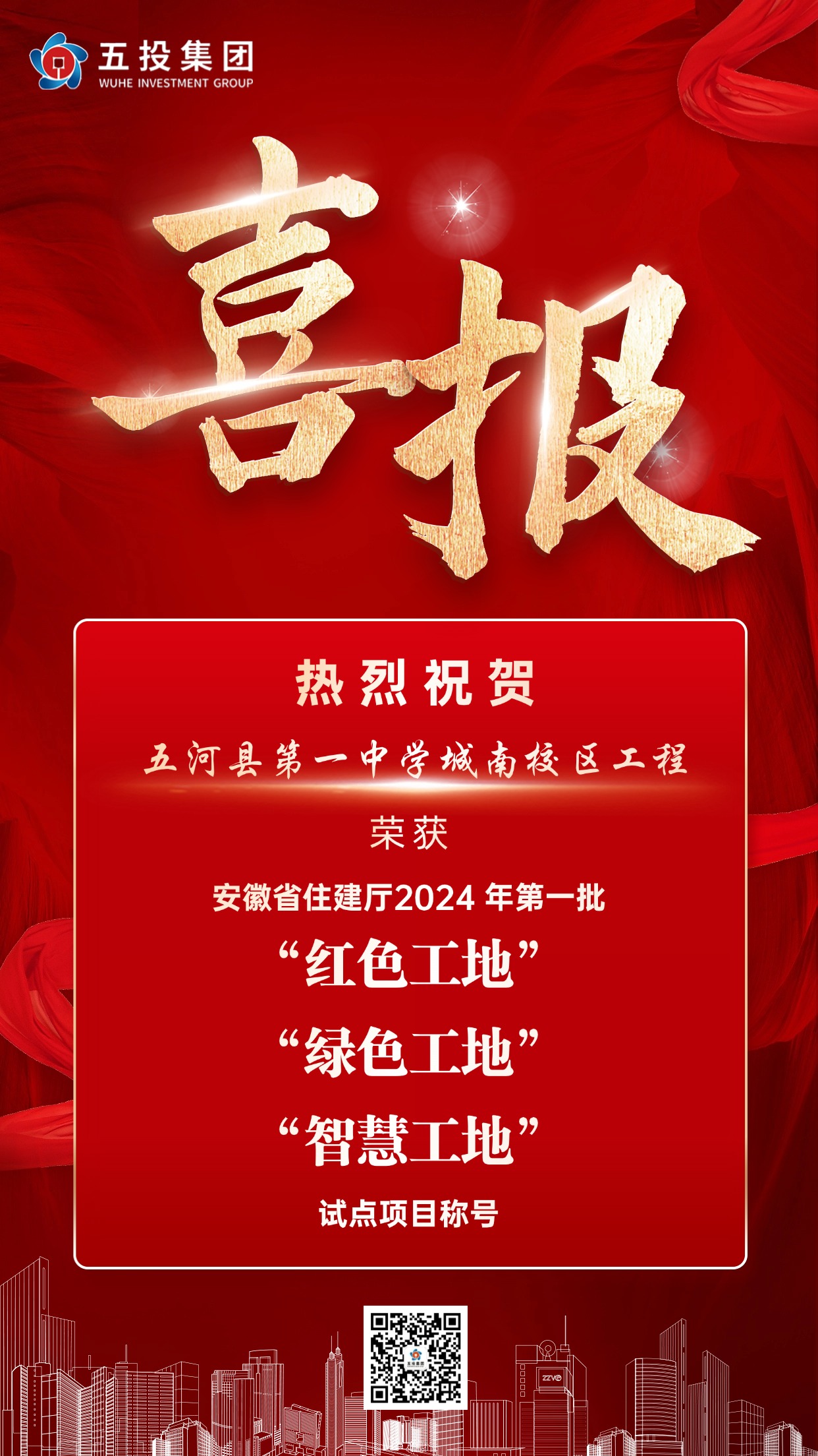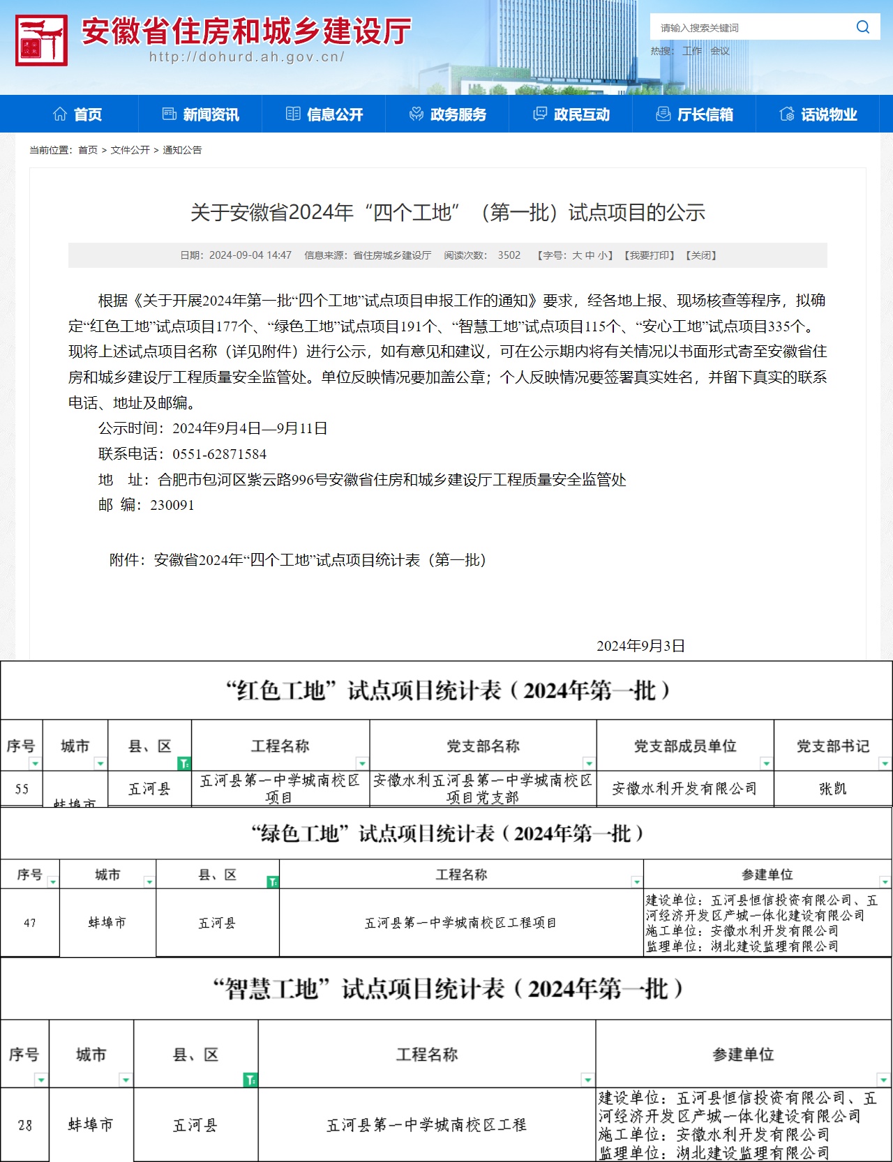 近日,从安徽省住房和城乡建设厅《关于安徽省2024年“四个工地”(第一批)试点项目的公示》获悉,五河县第一中学城南校区工程荣获安徽省 2024 年“四个工地”(第一批)试点“红色工地”“绿色工地”“智慧工地”项目称号。