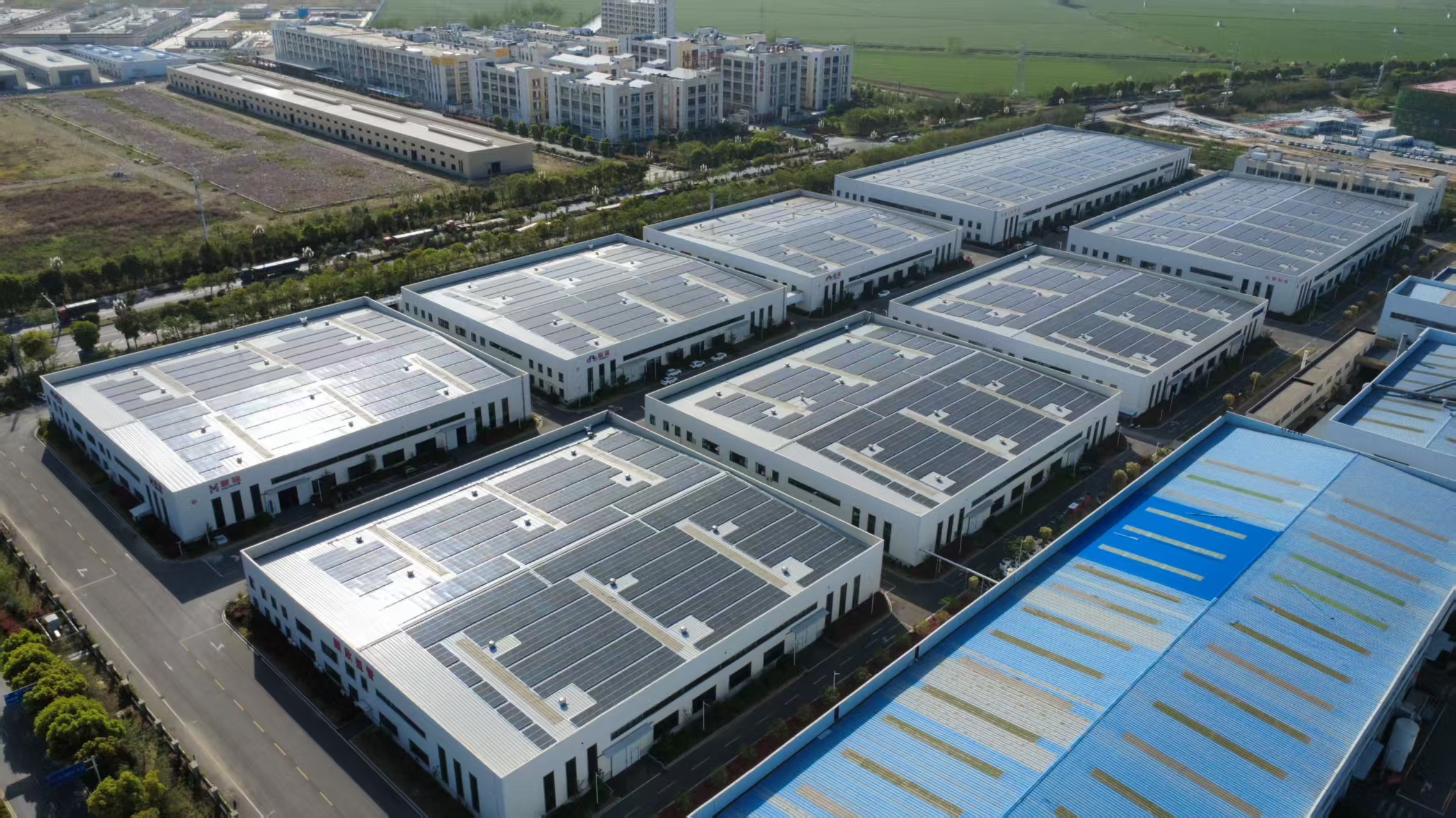 五河县自行车产业园二期屋顶分布式光伏发电项目位于沱湖大道东侧、兴浍西路北侧,总装机容量达5.88MWp,交流侧5415KW,共布置光伏组件9976块;五河县绿色食品产业园二期屋顶分布式光伏发电项目坐落于沱湖大道西侧、兴浍西路南侧,总装机容量为5.29MWp,交流侧4715KW,布置光伏组件8969块。