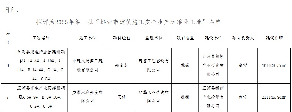 日前,蚌埠市住房和城乡建设局公布2025年第一批"蚌埠市建筑施工安全生产标准化工地"名单,由古天乐太阳集团城投资建设的五河县光电产业园项目成功入选。