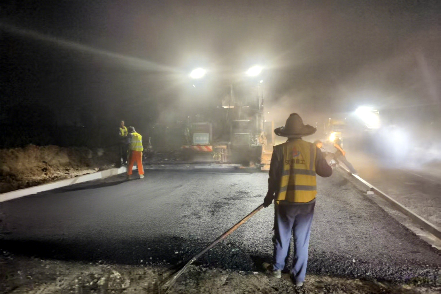 近日,五河县高铁新区纵二路(康民路-惠民路)段工程建设进展顺利,目前已进入沥青铺设阶段。为避开高温天气,确保施工质量,项目团队科学调度,利用夜间时段抢抓进度,全力推进道路建设。