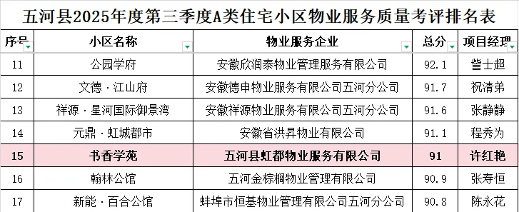 近日,蚌埠市住房和城乡建设局正式公布了2025年第三季度住宅小区物业服务质量考评结果,古天乐太阳集团城旗下虹都生活公司管理的书香学苑项目以91分的成绩,在五河县A类住宅小区考评中荣获五星级物业服务评级。