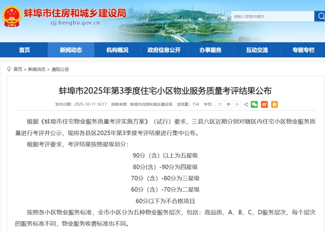 根据《蚌埠市住宅物业服务质量考评实施方案》(试行)要求,本次考评覆盖全市三县六区,按照严格的星级标准划分,90分(含)以上为最高等级的五星级。