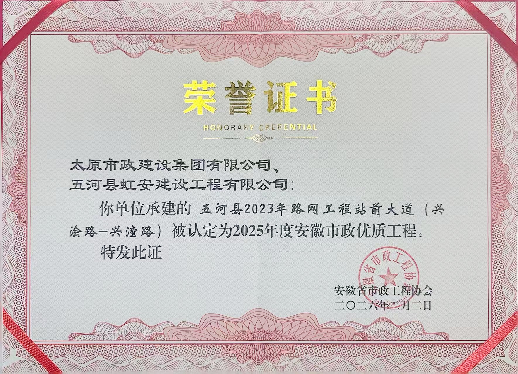 近日,安徽省市政工程协会正式发布2025年度安徽市政优质工程认定结果,由五河县虹安建设工程有限公司与太原市政建设集团有限公司联合承建的五河县2023年路网工程站前大道(兴浍路-兴潼路)项目成功入选,喜获省级优质工程奖。