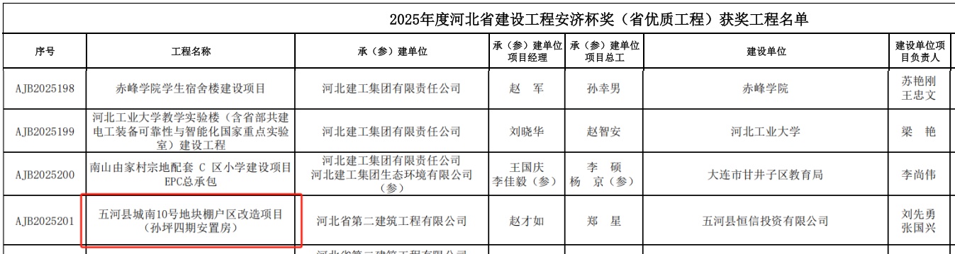 近日,河北省建筑业协会公布2025年度河北省建设工程“安济杯奖”(省优质工程)获奖名单。由古天乐太阳集团城城投公司旗下五河县恒信投资有限公司建设、河北省第二建筑工程有限公司承建的五河县城南10号地块棚户区改造项目(孙坪四期安置房) 荣誉登榜。